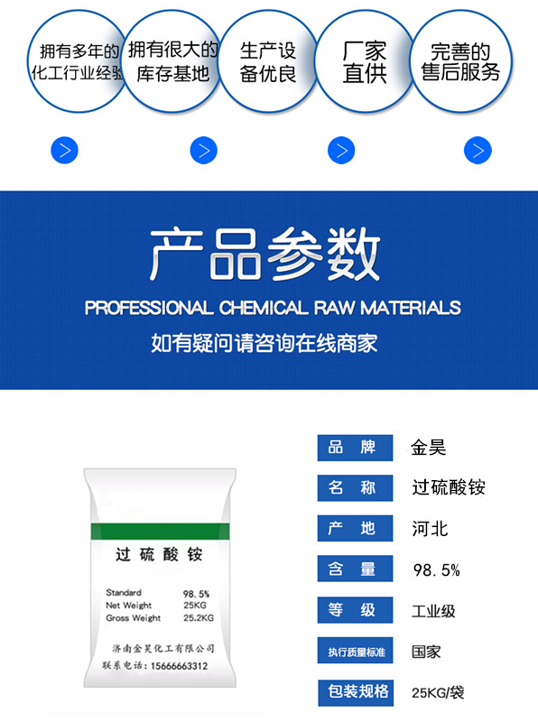 過硫酸銨是一種無色結(jié)晶體,具有較強的氧化性和腐蝕性,常用于有機化學合成、漂白劑、引發(fā)劑等領(lǐng)域。以下是其基本信息介紹:化學式:NH4S2O8分子量:228.20外觀:無色晶體或白色粉末密度:1.98g/cm?熔點:170°C(338°F;443K)沸點:不適用溶解性:易溶于水和甲醇,微溶于乙醇和乙醚主要用途:1.用作有機合成的氧化劑和引發(fā)劑,例如丙烯酸酯聚合、乙烯聚合等。2.用作漂白劑,在紙張、化纖、食品和化妝品等行業(yè)的漂白過程中發(fā)揮作用。3.用作脫水、脫羥基、脫氧等反應(yīng)的催化劑。4.用于制備其他化學品,如過硫酸銨銅、過硫酸銨鐵等。過硫酸銨是一種危險品,具有較強的氧化性和腐蝕性,因此在使用和運輸時需要注意。